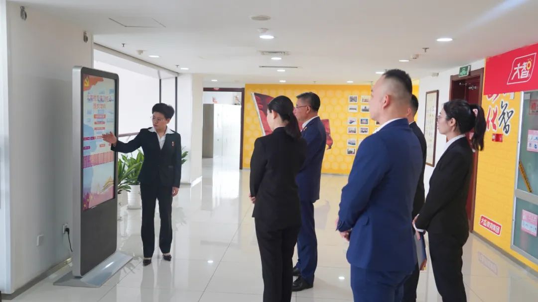 王現(xiàn)芹帶領(lǐng)大家參觀了黨建長廊,詳細(xì)介紹了大智組織架構(gòu)、企業(yè)文化等相關(guān)情況,以及“智惠黨建一三九”黨建工作模式,黨建引領(lǐng)下的“一帶一促”群團(tuán)建設(shè)理念和“智惠+”群團(tuán)建設(shè)模式,大家對大智的黨建工作給予了充分肯定和高度認(rèn)可。