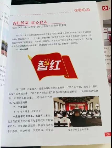 大智臨沂區(qū)域成立于2011年,在蘭山區(qū)委組織部、蘭山區(qū)教育和體育局及集團黨委的大力支持和領(lǐng)導(dǎo)下,于2014年4月成立黨支部,后又相繼成立了團總支、婦女委員會、工會等群團組織,經(jīng)過實踐探索,大智臨沂區(qū)域打造了”智紅沂蒙三個三“工作法、“智紅沂蒙 紅心育人”黨建工作品牌,真正做到服務(wù)社會,服務(wù)企業(yè),服務(wù)黨員。在黨建工作中不斷創(chuàng)新并與其他黨支部進行了黨建共建。