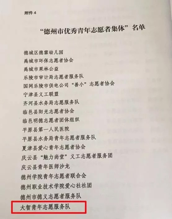 近日,共青團(tuán)德州市委、德州市志愿者協(xié)會(huì)聯(lián)合發(fā)布《關(guān)于公布2018年度德州“最美(優(yōu)秀)青年志愿者、最美(優(yōu)秀)青年志愿者集體”的通知》,大智德州區(qū)域青年志愿服務(wù)隊(duì)被授予“德州市優(yōu)秀青年志愿者集體”。