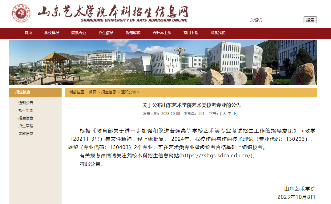 山東藝術(shù)學(xué)院本科招生信息網(wǎng)截圖