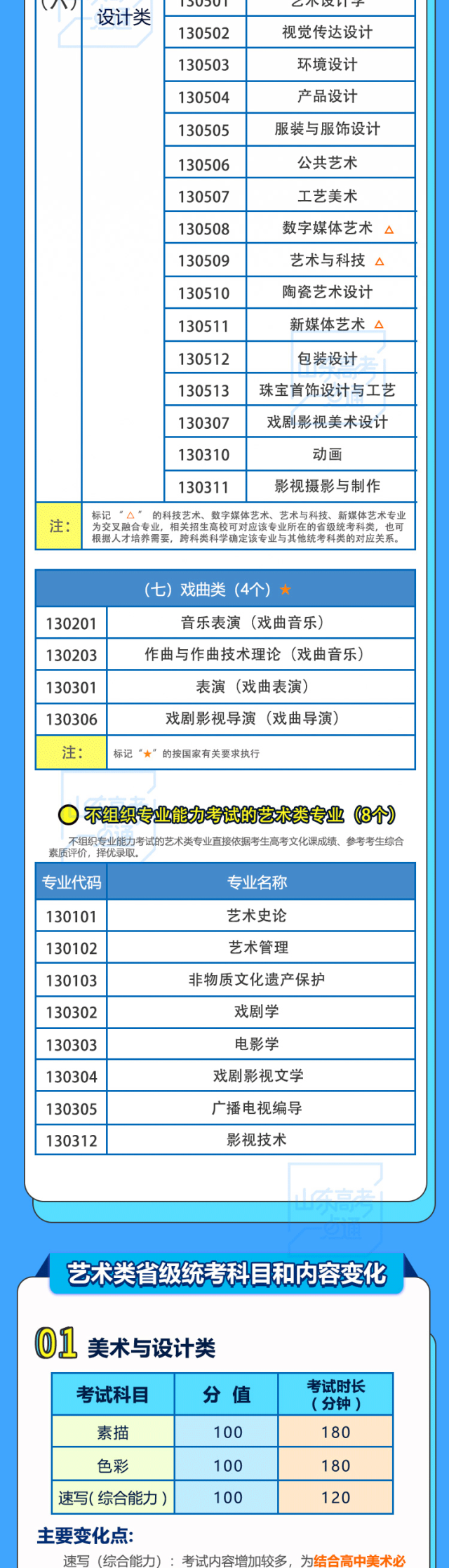 關(guān)于公布山東藝術(shù)學(xué)院藝術(shù)類校考專業(yè)的公告根據(jù)《教育部關(guān)于進(jìn)一步加強(qiáng)和改進(jìn)普通高等學(xué)校藝術(shù)類專業(yè)考試招生工作的指導(dǎo)意見(jiàn)》(教學(xué)〔2021〕3號(hào))等文件精神,經(jīng)上級(jí)批復(fù), 2024年,我校作曲與作曲技術(shù)理論(專業(yè)代碼:130203)、雕塑(專業(yè)代碼:130403)2個(gè)專業(yè),可在藝術(shù)類專業(yè)省級(jí)統(tǒng)考合格基礎(chǔ)上組織???。有關(guān)報(bào)考詳情請(qǐng)關(guān)注我校本科招生信息網(wǎng)站(https://zsbgs.sdca.edu.cn/)。此前,山東省教育招生考試院發(fā)布了《關(guān)于印發(fā)山東省進(jìn)一步加強(qiáng)和改進(jìn)普通高等學(xué)校藝術(shù)類專業(yè)考試招生工作實(shí)施方案的通知》和《山東省2024年普通高考報(bào)考提醒》,公布了2024年特殊類型招生政策變化和藝術(shù)類招生政策變化。2024年起,全國(guó)范圍內(nèi)將藝術(shù)類專業(yè)統(tǒng)一分為美術(shù)與設(shè)計(jì)類、書法類、音樂(lè)類、舞蹈類、播音與主持類、表(導(dǎo)) 演類等7個(gè)類別,其中美術(shù)與設(shè)計(jì)類、書法類、音樂(lè)類、舞蹈類、播音與主持類、表 (導(dǎo)) 演類6個(gè)類別實(shí)行省級(jí)統(tǒng)考,戲曲類按教育部最新要求執(zhí)行。