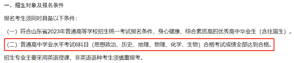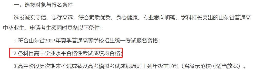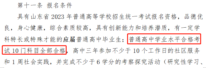 ?青島大學(xué):在2023年綜合評價(jià)招生的報(bào)名條件中有明確的規(guī)定,普通高中學(xué)業(yè)水平合格考試10門科目全部合格。