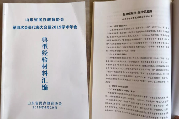 特別值得一提的是,《山東省民辦教育協(xié)會第四次會員代表大會暨2019學(xué)術(shù)年會典型經(jīng)驗(yàn)材料匯編》刊登了大智“黨建促規(guī)范 規(guī)范促發(fā)展”的典型經(jīng)驗(yàn)材料。