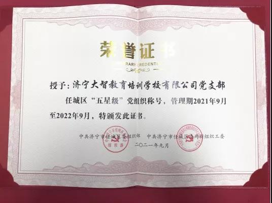 近日,中共濟寧市任城區(qū)委組織部、中共濟寧市任城區(qū)委兩新組織工作委員會發(fā)布《關(guān)于表彰“五星級”兩新組織黨組織和“紅帆”黨建工作指導(dǎo)員的決定》(濟任組發(fā)〔2021〕19號)有關(guān)規(guī)定,大智濟寧區(qū)域黨支部榮獲任城區(qū)“五星級”黨組織稱號!