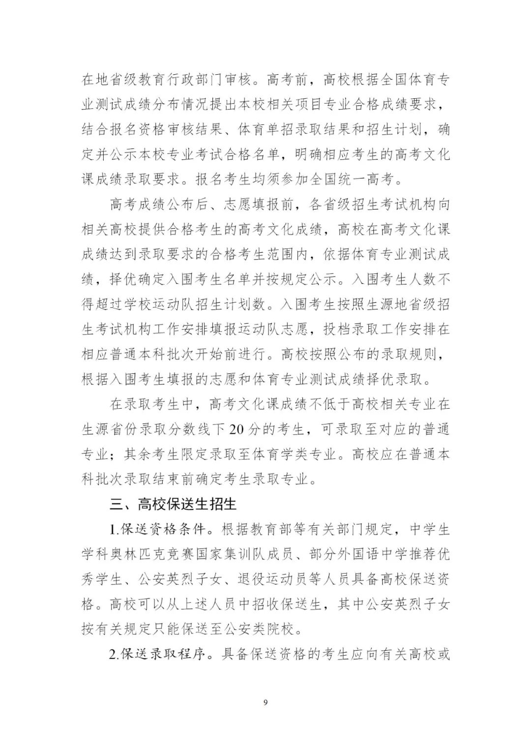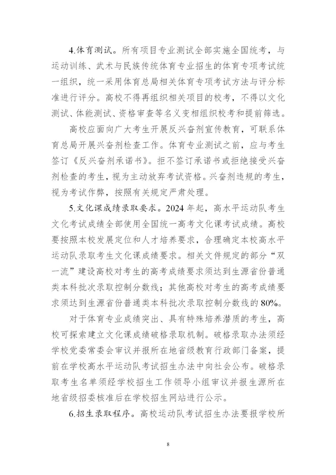 4.平穩(wěn)做好高水平運(yùn)動(dòng)隊(duì)考試招生。有關(guān)高校要緊緊圍繞高水平運(yùn)動(dòng)隊(duì)工作定位,根據(jù)學(xué)校運(yùn)動(dòng)隊(duì)建設(shè)規(guī)劃,優(yōu)化招生項(xiàng)目范圍。要嚴(yán)格招生程序,完善評(píng)價(jià)辦法和招生錄取機(jī)制,合理確定文化成績(jī)要求。2024年起,高水平運(yùn)動(dòng)隊(duì)考生文化考試成績(jī)?nèi)渴褂萌珖y(tǒng)一高考文化課考試成績(jī);專業(yè)測(cè)試全部納入全國統(tǒng)考,由體育總局牽頭組織實(shí)施,高校不再組織相關(guān)???。