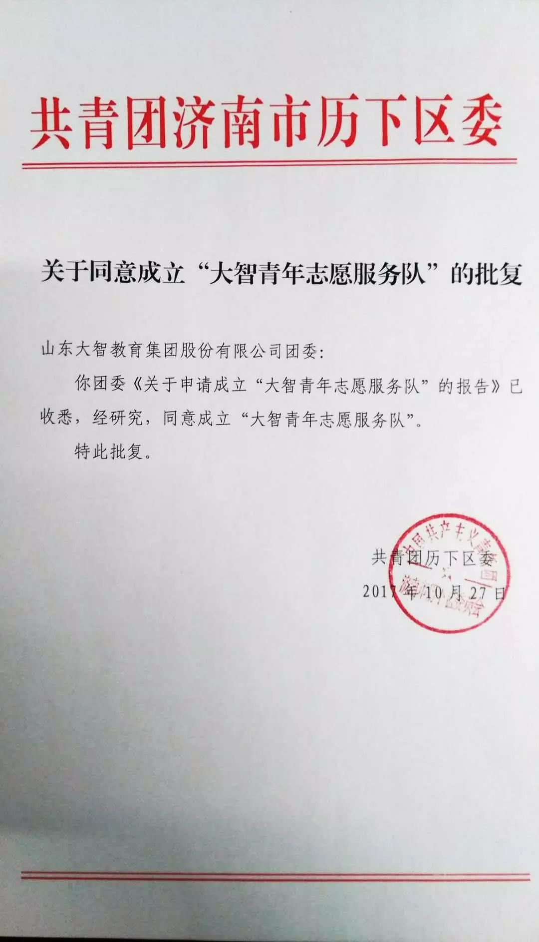 為了建立長期有效的機(jī)制,更好地開展公益事業(yè),肩負(fù)起社會責(zé)任, 10月27日,大智青年志愿服務(wù)隊(duì)獲批復(fù)正式成立!共青團(tuán)歷下區(qū)委同意成立大智青年...