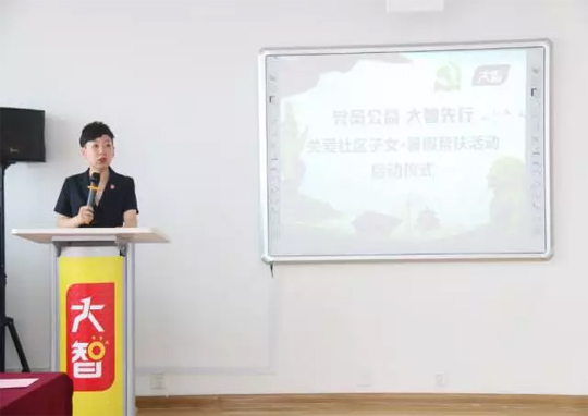07月24日,由濟(jì)南市歷下區(qū)解放路街道黨工委聯(lián)合大智小班黨支部發(fā)起的“黨員公益 大智先行——關(guān)愛(ài)社區(qū)子女”暑假幫扶活動(dòng)啟動(dòng)儀式在大智控股集團(tuán)總部舉行。解放路街道青龍街社區(qū)居委會(huì)副主任張蕊等領(lǐng)導(dǎo),大智控股集團(tuán)黨委委員、濟(jì)南區(qū)域總校長(zhǎng)宋靜文,接受幫扶的社區(qū)家長(zhǎng)和孩子以及小班黨支部代表參加了儀式。