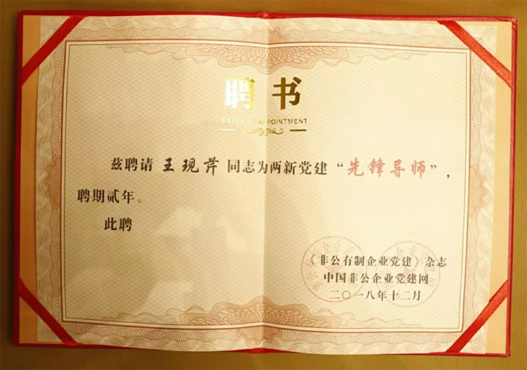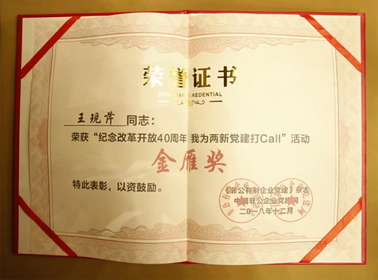 在此前《非公有制企業(yè)黨建》雜志社組織的“紀念改革開放40周年,我為兩新黨建打call”大型視頻展播活動中,來自全國的300余名兩新黨組織書記參與到活動中,王現芹的先進事跡視頻脫穎而出,成為全國40名“紀念改革開放40周年 我為兩新黨建打CALL”金雁獎獲獎者之一。