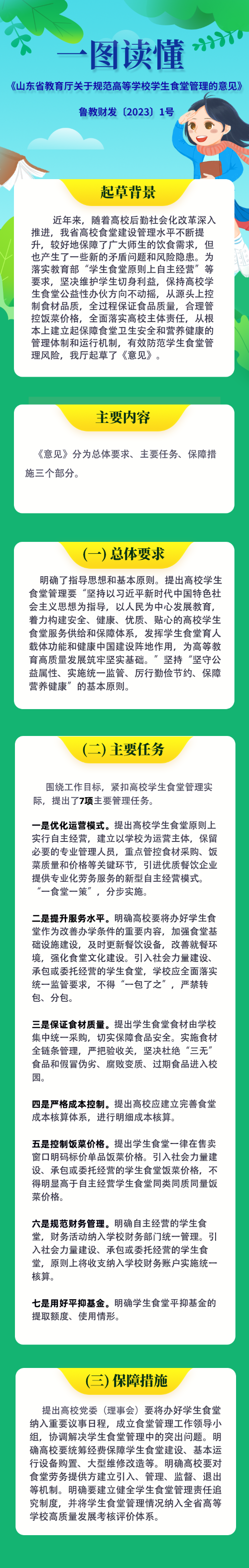 8月30日,《山東省教育廳關(guān)于規(guī)范高等學(xué)校學(xué)生食堂管理的意見》(魯教財(cái)發(fā)〔2023〕1號(hào),以下簡(jiǎn)稱《意見》)正式印發(fā),現(xiàn)解讀如下。一、起草背...