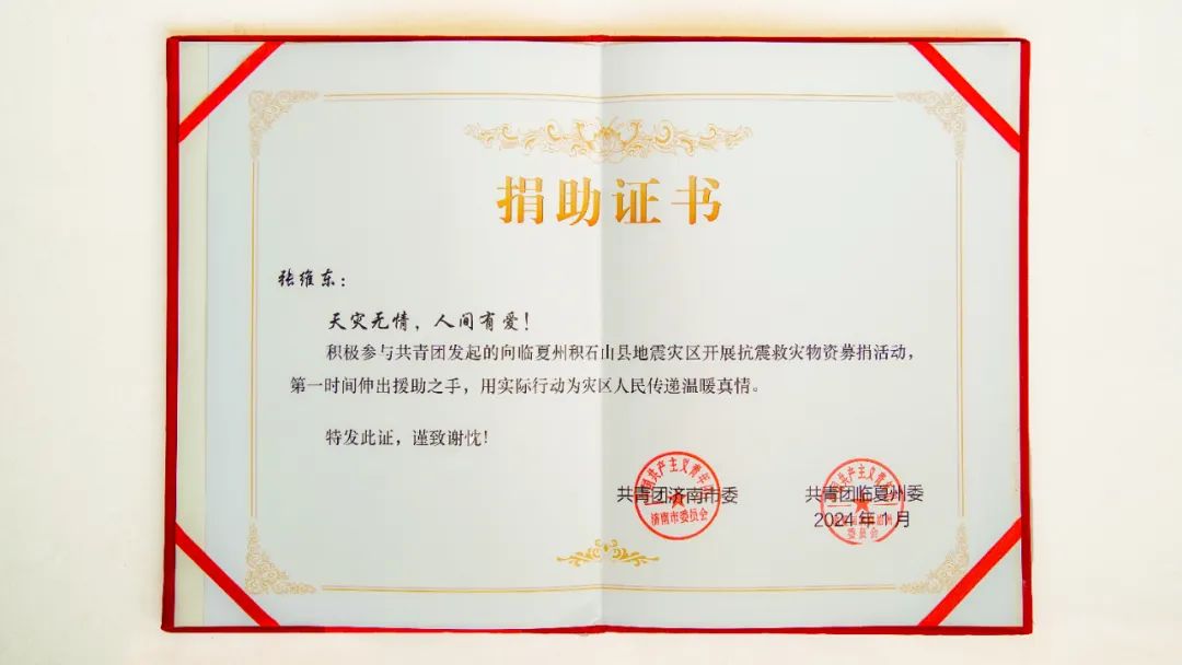 張維東獲評東西部協(xié)作和援助甘肅積石山縣地震災(zāi)區(qū)工作作出積極貢獻(xiàn)的青年企業(yè)家