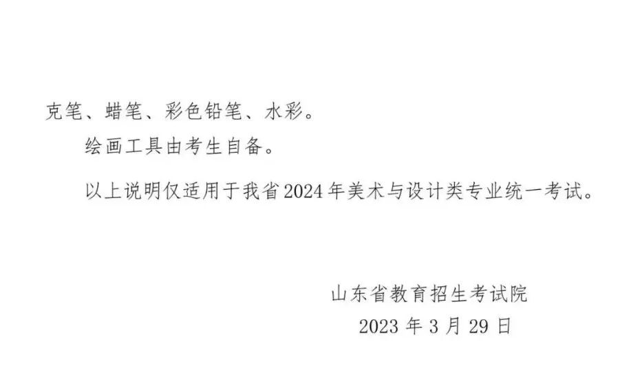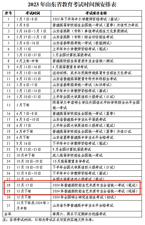 據(jù)山東省招生考試院發(fā)布的通知安排,2024年普通高校招生藝術(shù)類(lèi)專(zhuān)業(yè)全省統(tǒng)一考試(筆試)將于2023年12月17日舉行,2023年12月下旬舉行2024年普通高校招生藝術(shù)類(lèi)專(zhuān)業(yè)全省統(tǒng)一考試(現(xiàn)場(chǎng))。