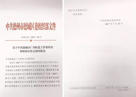 08月02日,中國共產(chǎn)黨德州市德城區(qū)委組織部正式批復(fù)同意成立中共山東大智控股集團(tuán)股份有限公司德州分公司支部委員會。 這是大智控股集團(tuán)黨建...