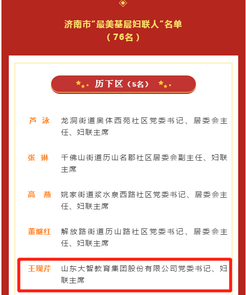 近日,濟(jì)南市婦聯(lián)公布了最美基層?jì)D聯(lián)人名單,大智教育集團(tuán)黨委書記、婦聯(lián)主席王現(xiàn)芹被評(píng)為濟(jì)南市最美基層?jì)D聯(lián)人。 在王現(xiàn)芹書