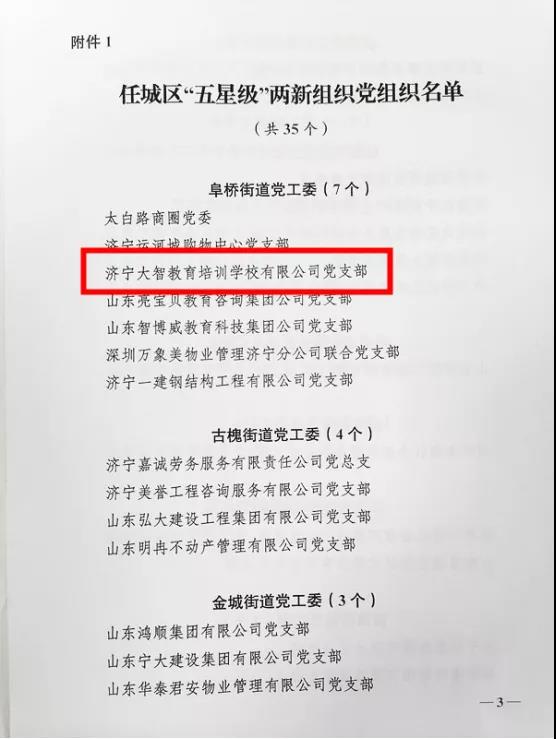 近日,中共濟寧市任城區(qū)委組織部、中共濟寧市任城區(qū)委兩新組織工作委員會發(fā)布《關(guān)于表彰“五星級”兩新組織黨組織和“紅帆”黨建工作指導(dǎo)員的決定》(濟任組發(fā)〔2021〕19號)有關(guān)規(guī)定,大智濟寧區(qū)域黨支部榮獲任城區(qū)“五星級”黨組織稱號!