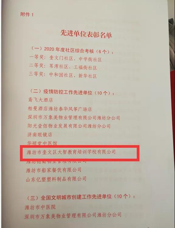 2020年新冠肺炎疫情爆發(fā)以來,大智教育集團黨委積極響應(yīng)疫情防控要求,扎實開展各項疫情防控措施,近日,大智濰坊區(qū)域獲得“疫情防控工作先進(jìn)單位”榮譽稱號。