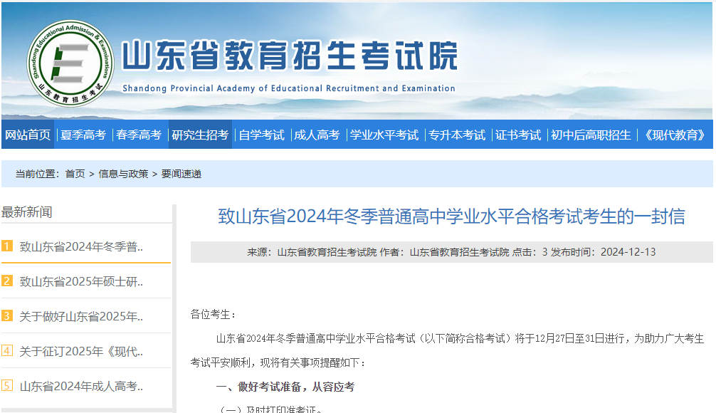 山東省教育招生考試院發(fā)布《致山東省2024年冬季普通高中學(xué)業(yè)水平合格考試考生的一封信》提醒各位考生,請(qǐng)考生在規(guī)定時(shí)間登錄報(bào)名系統(tǒng)自行打印準(zhǔn)考證,打印時(shí)間為:12月20日—12月25日每天9:00—17:00,12月26日—12月31日每天7:00—20:00。