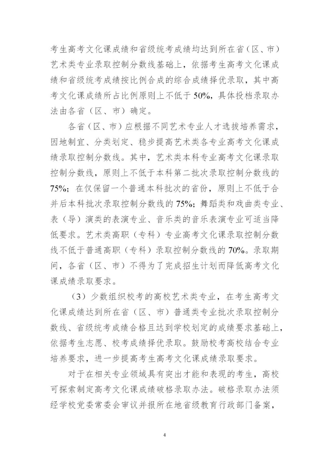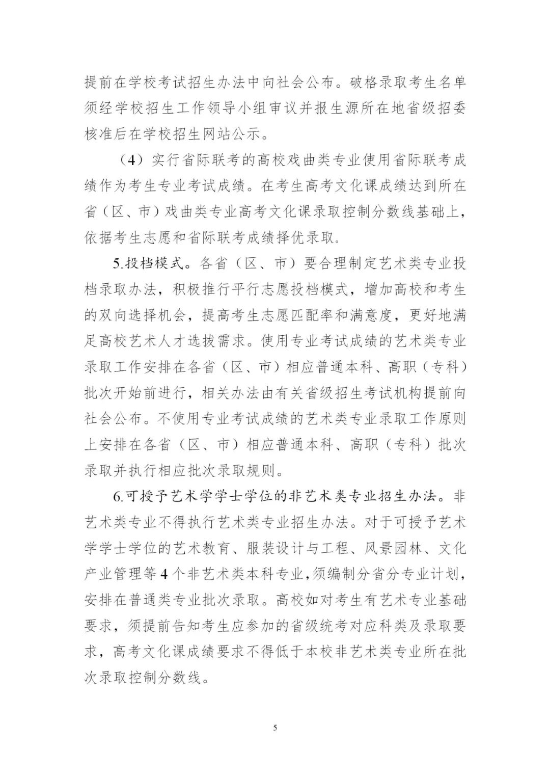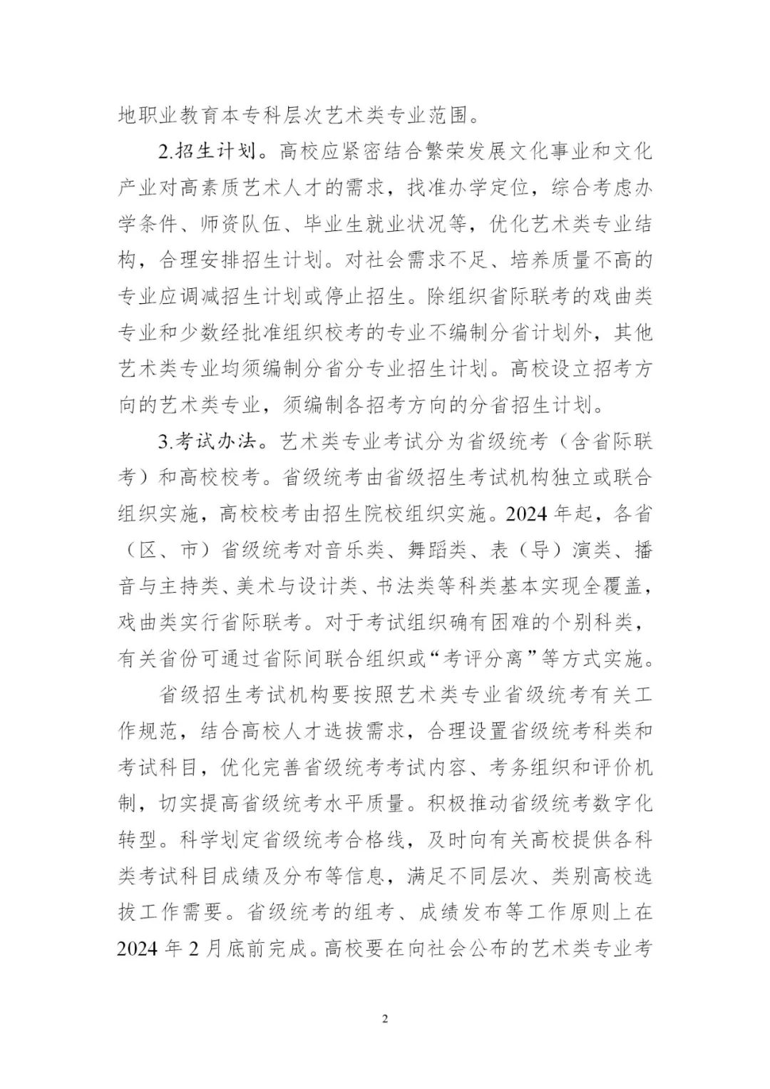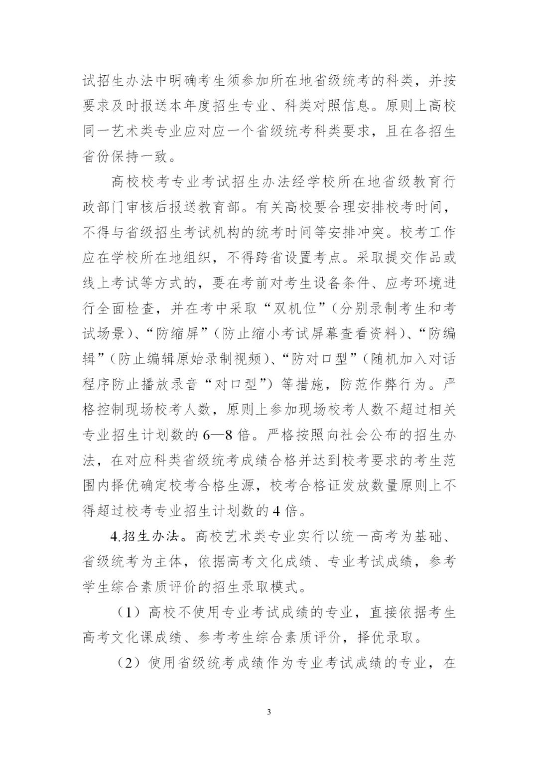 3.平穩(wěn)做好藝術(shù)類考試招生。各地要認(rèn)真落實(shí)藝術(shù)類專業(yè)考試招生改革部署,進(jìn)一步加強(qiáng)省級(jí)統(tǒng)考能力建設(shè),考試科類基本實(shí)現(xiàn)全覆蓋。要對(duì)照有關(guān)工作規(guī)范,完善省級(jí)統(tǒng)考科目和內(nèi)容,優(yōu)化考試組織和流程,推進(jìn)省級(jí)統(tǒng)考提質(zhì)增效。要科學(xué)制定藝術(shù)類專業(yè)招生錄取辦法,確保改革平穩(wěn)落地。少數(shù)專業(yè)特色鮮明、人才培養(yǎng)質(zhì)量較高的藝術(shù)院校,經(jīng)省級(jí)教育行政部門批準(zhǔn)可在省級(jí)統(tǒng)考基礎(chǔ)上組織個(gè)別專業(yè)???。有關(guān)高校要結(jié)合人才培養(yǎng)定位,科學(xué)制定??紝I(yè)考試招生辦法,加強(qiáng)與省級(jí)統(tǒng)考銜接,合理確定??夹问郊皟?nèi)容。2024年起,高校高水平藝術(shù)團(tuán)不再從高校招生環(huán)節(jié)選拔,由有關(guān)高校從在校生中遴選培養(yǎng)。