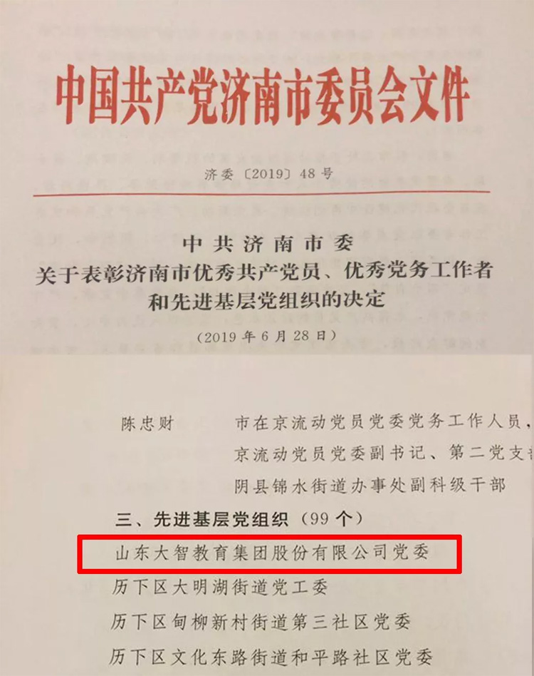 此次被評為“濟(jì)南市先進(jìn)基層黨組織”將激勵大智控股集團(tuán)黨委再接再厲,不斷提升黨建工作質(zhì)量和水平,努力在引領(lǐng)改革發(fā)展,推動做大做強(qiáng)中當(dāng)先鋒、做表率,為濟(jì)南市建設(shè)“大強(qiáng)美富通”現(xiàn)代化國際大都市作出積極貢獻(xiàn)。