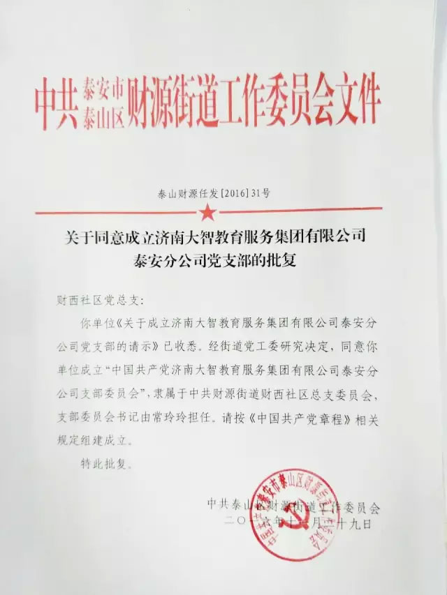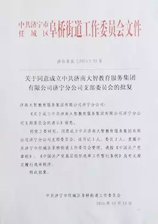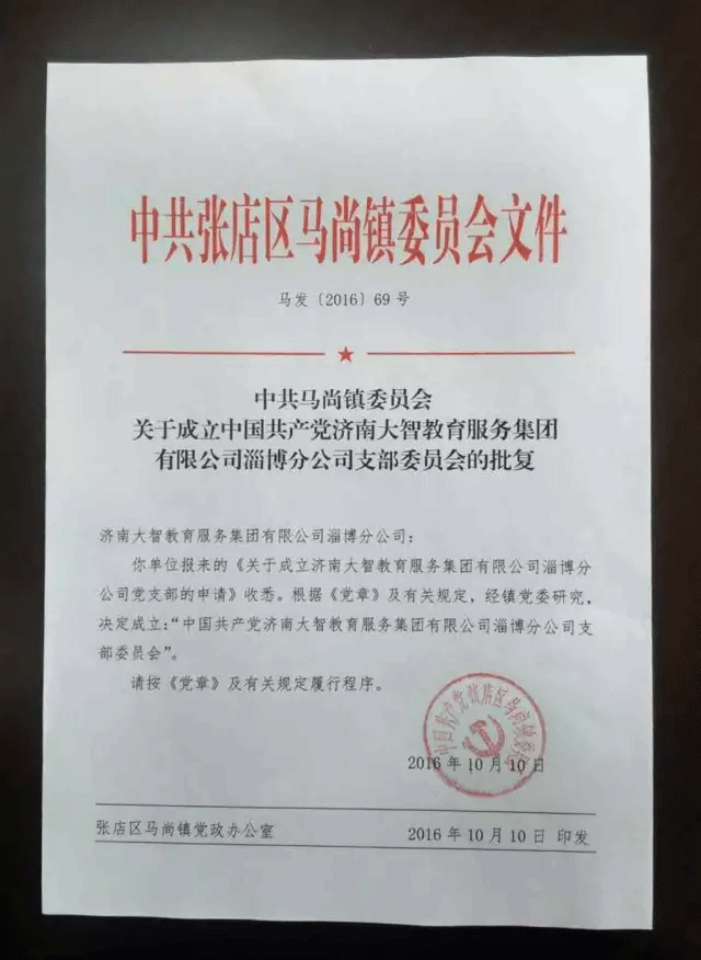 2016年10月10日,中共張店區(qū)馬尚鎮(zhèn)委員會正式批復(fù)同意成立中共濟南大智教育服務(wù)集團有限公司淄博分公司支部委員會。這是大智教育集團繼臨沂分...