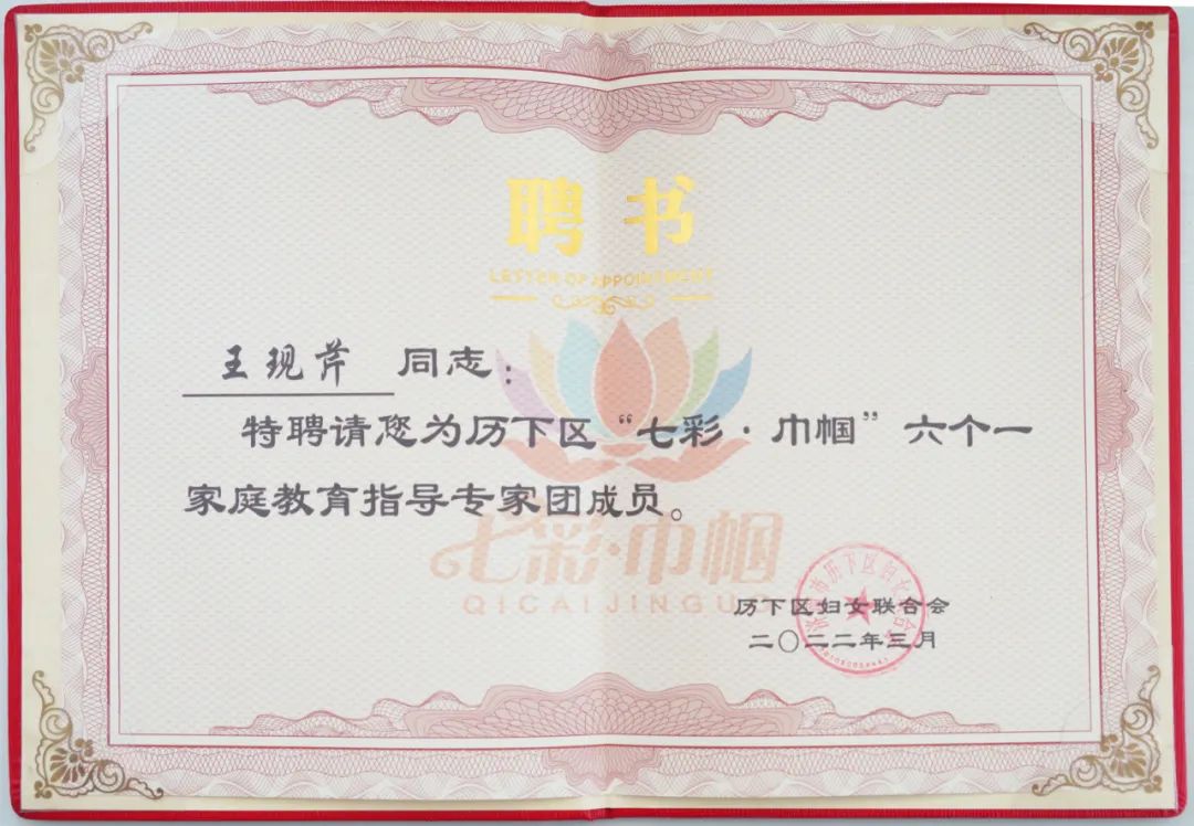王現(xiàn)芹被聘為歷下區(qū)“七彩•巾幗”六個(gè)一家庭教育指導(dǎo)專家團(tuán)成員,她表示,將堅(jiān)持落實(shí)習(xí)總書記關(guān)于“注重家庭、注重家教、注重家風(fēng)”的重要論述,全方位解讀家庭、家教、家風(fēng)話題和家庭建設(shè)的深刻內(nèi)涵,當(dāng)好家庭建設(shè)的“指導(dǎo)員”。