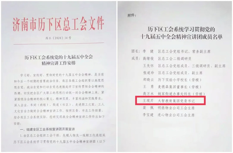 為更好的學習、宣傳、貫徹好黨的十九屆五中全會精神,切實把濟南市歷下區(qū)廣大職工的思想行動統(tǒng)一到全會精神上來,01月12日,濟南市歷下區(qū)工會系統(tǒng)黨的十九屆五中全會精神宣講報告會在歷下區(qū)職工服務(wù)中心舉行。歷下區(qū)總工會黨組書記、常務(wù)副主席李健出席會議并作宣講報告,大智控股集團黨委書記王現(xiàn)芹受邀參加會議。