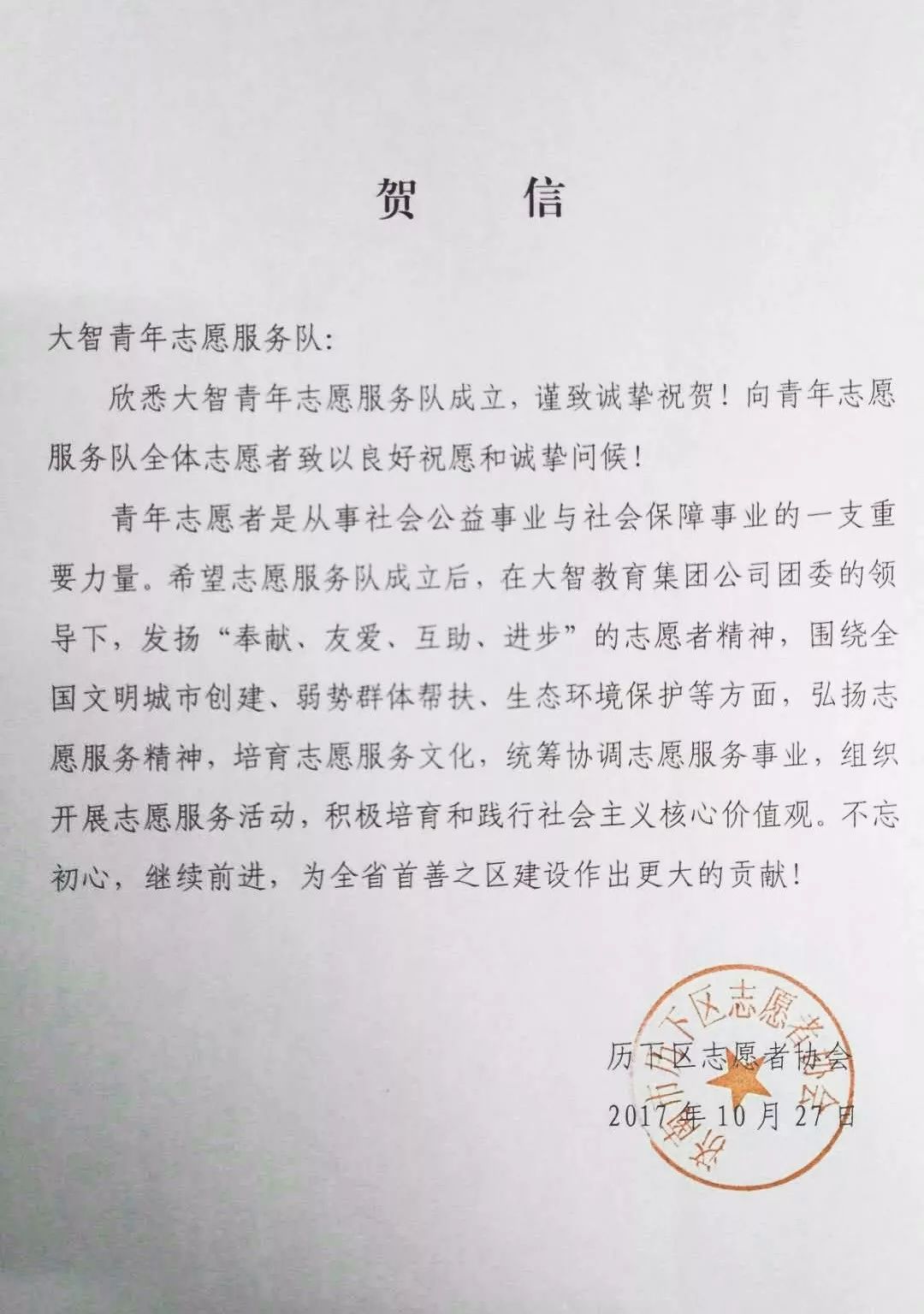 歷下區(qū)志愿者協會發(fā)來賀信。
